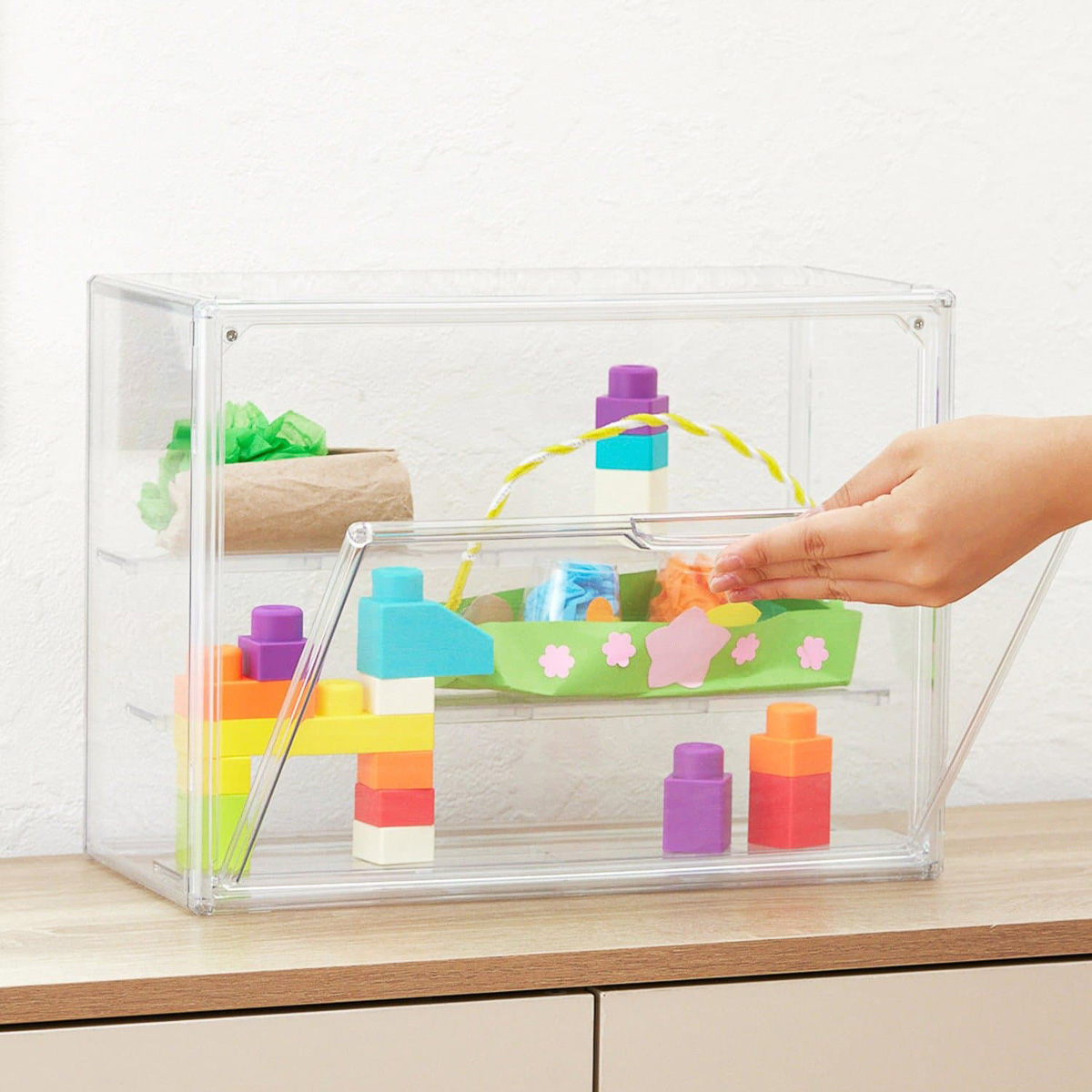 子どもの工作を飾ったり、コレクションをディスプレイするのに最適なクリアケース。棚を設置すると小さなサイズのモノを綺麗に並べられる。2段までなら重ねることもできる。
