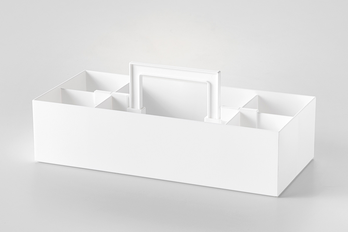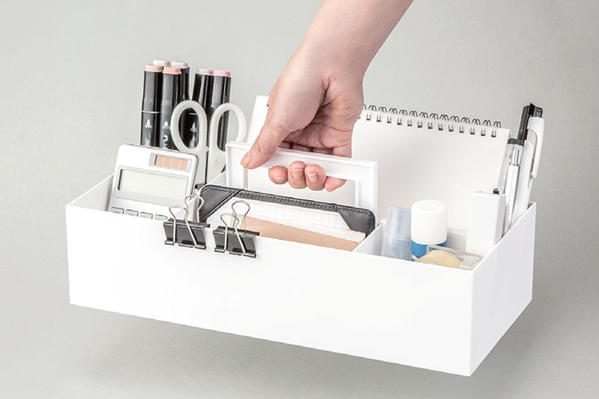 引き出しの中はとかくグチャグチャになりがちだが、この整理BOXを仕切りとして使えば小物も簡単に整理整頓できる。色はグレーとフロストホワイトの2色展開。使い方は工夫次第。