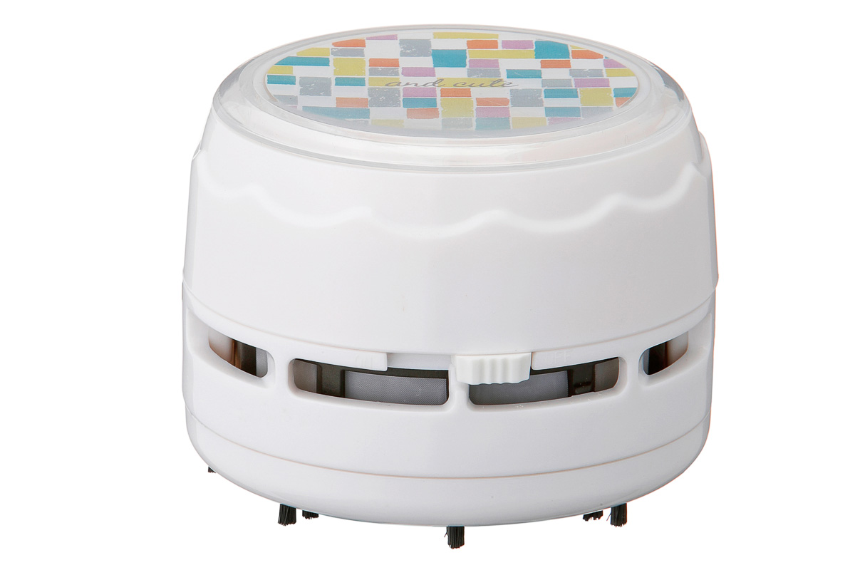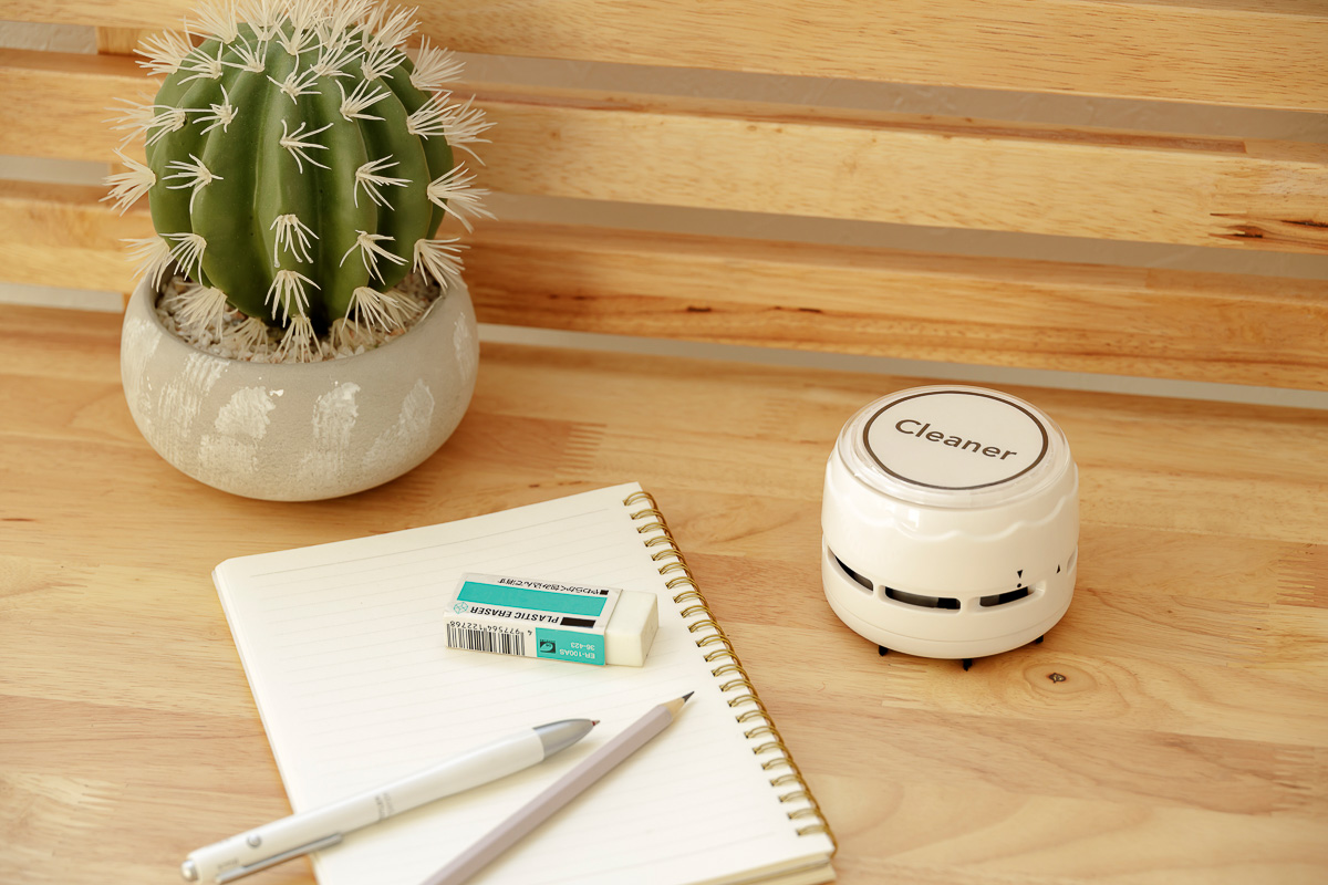 消しゴムのカスやパンくずなど、ちょっとしたゴミを手早く掃除できる卓上クリーナー。底面のブラシが壁際のゴミをかき出し、羽周りのスポンジの輪っかが髪の毛の巻き込みを防ぐ。