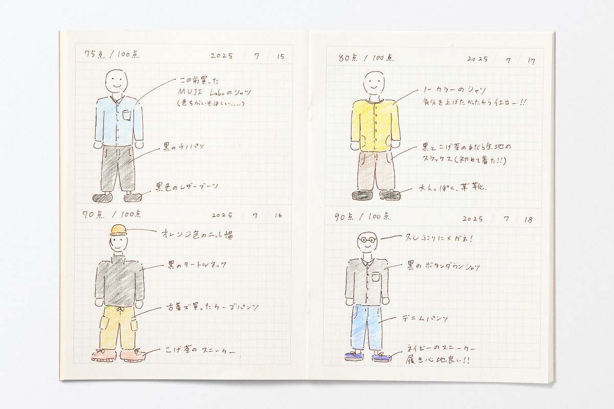 自分で日付を書き込んで、いつからでも使い始められる5mm方眼のノート。1ページに2コマの枠があり、2日分の記録ができる。自分のペースでいろいろな記録を自由に楽しめる。