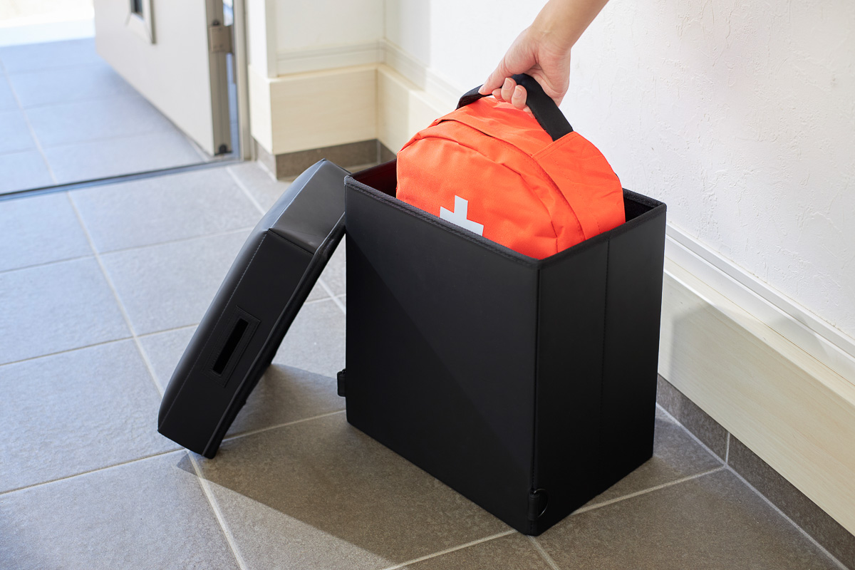 普段は部屋や玄関に置く収納スツールとして使え、いざという時は肩紐を出して災害用品を持ち運べるフェーズフリーなワザあり防災アイテム。ブラックとグレーの2色展開。