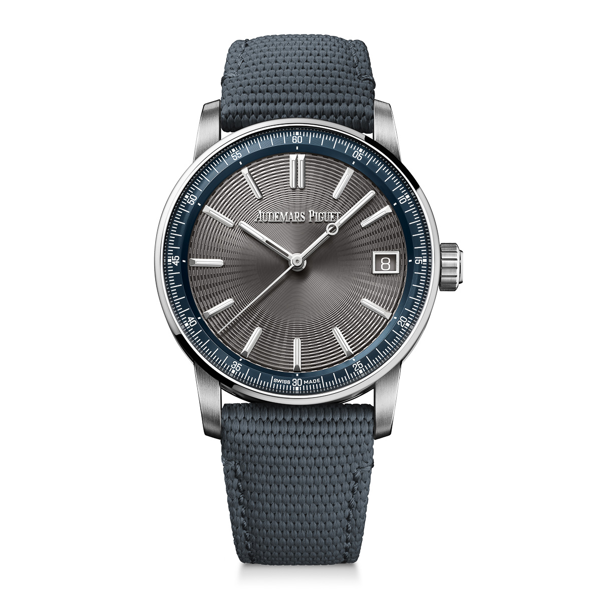 ポリッシュとサテンを繊細に切り替えた仕上げが、ステンレスに柔らかな陰影を宿し、光の角度ごとに異なる表情を描き出している。その奥行きこそが、オーデマ ピゲらしい建築的造形美をより際立たせているのだ。また、グレーとブルーを重ねた控えめな配色も深みがあり、長く愛される“一生モノ”としての風格を感じさせる。