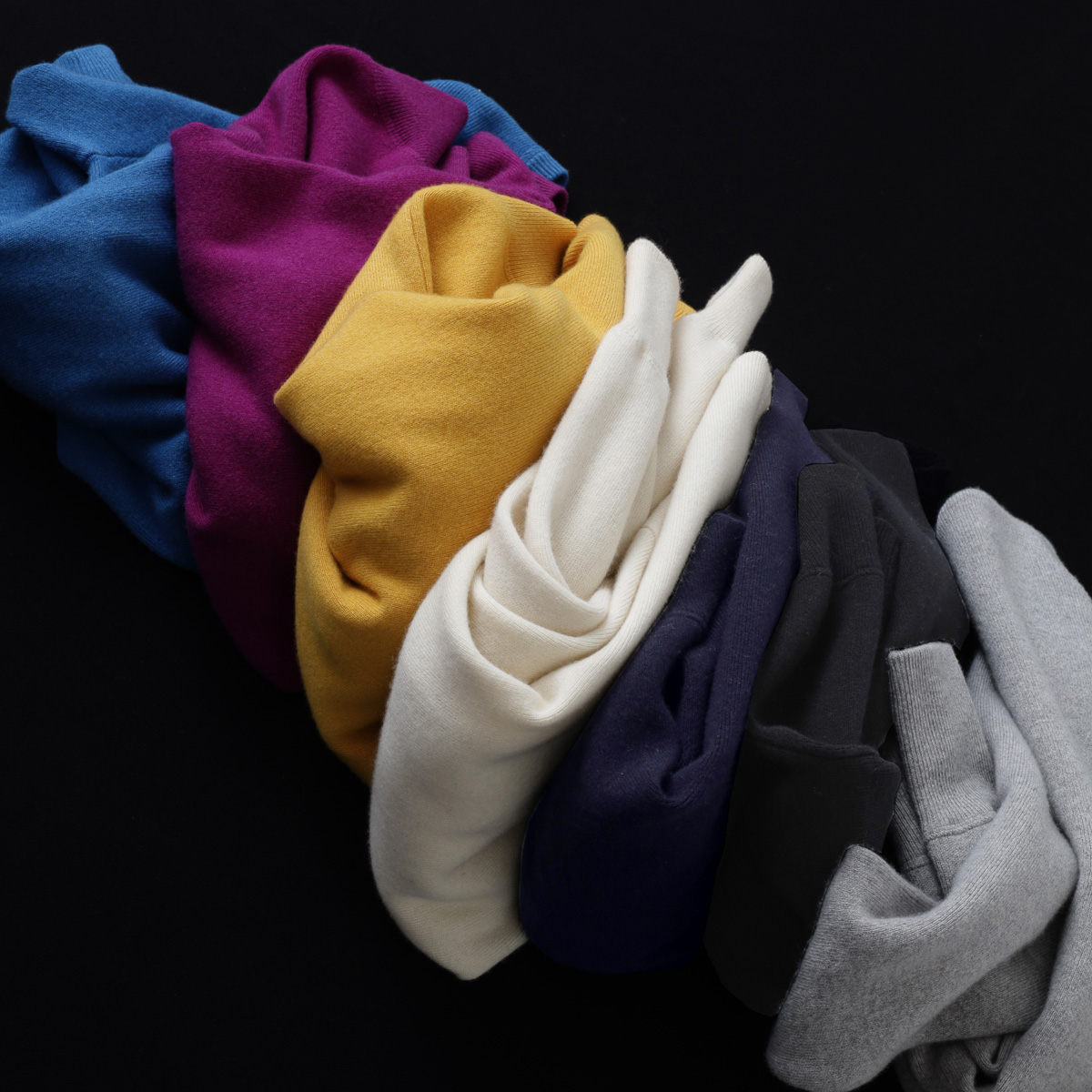 ▲カシミヤならではの鮮やかな発色も魅力。深みのあるトーンから軽やかな色まで、素材の上質さを引き立てる豊富な色展開を揃える