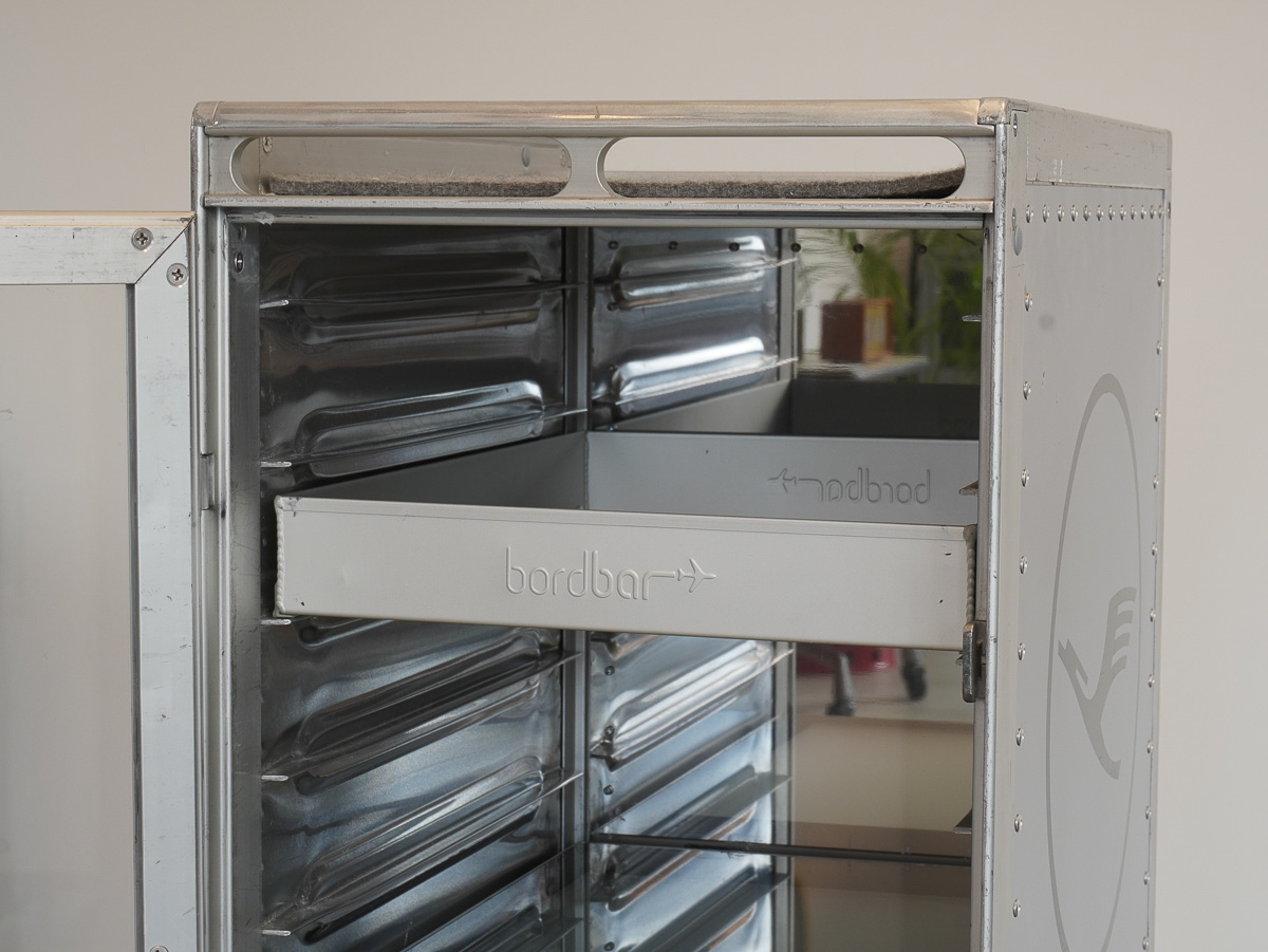キャビンアテンダントが飛行機内で機内食やドリンクを運ぶカートを再現したドイツ製ワゴン。足元の赤いペダルを踏むとロックが掛かり、緑のペダルを踏むと解除されるなど、機内での使い勝手を考えられた本物と変わらないこだわりっぷりに注目。夕食後のバータイム、ソファの横に持ってきてゆっくりお酒を楽しむ際にもピッタリだ。W301×H1030×D425mm