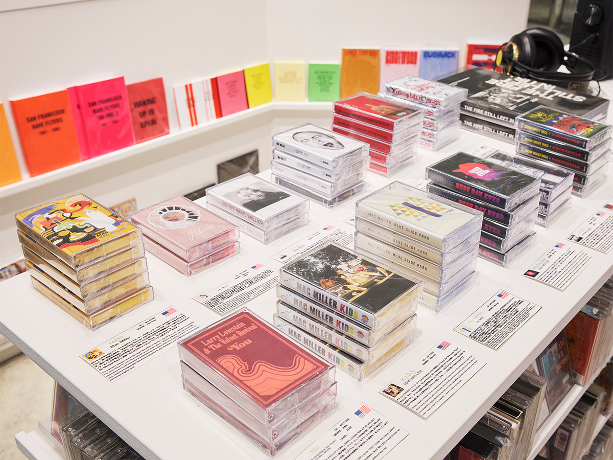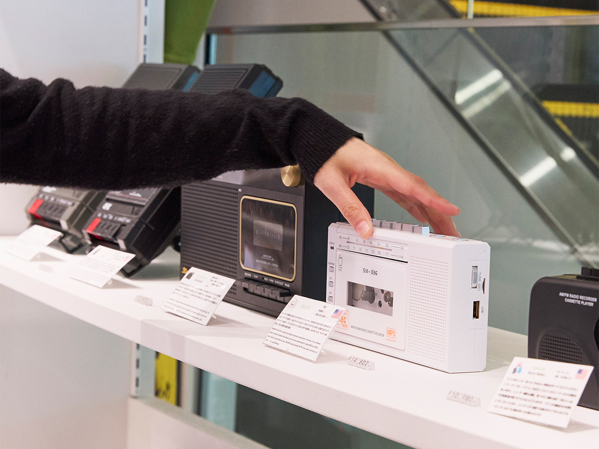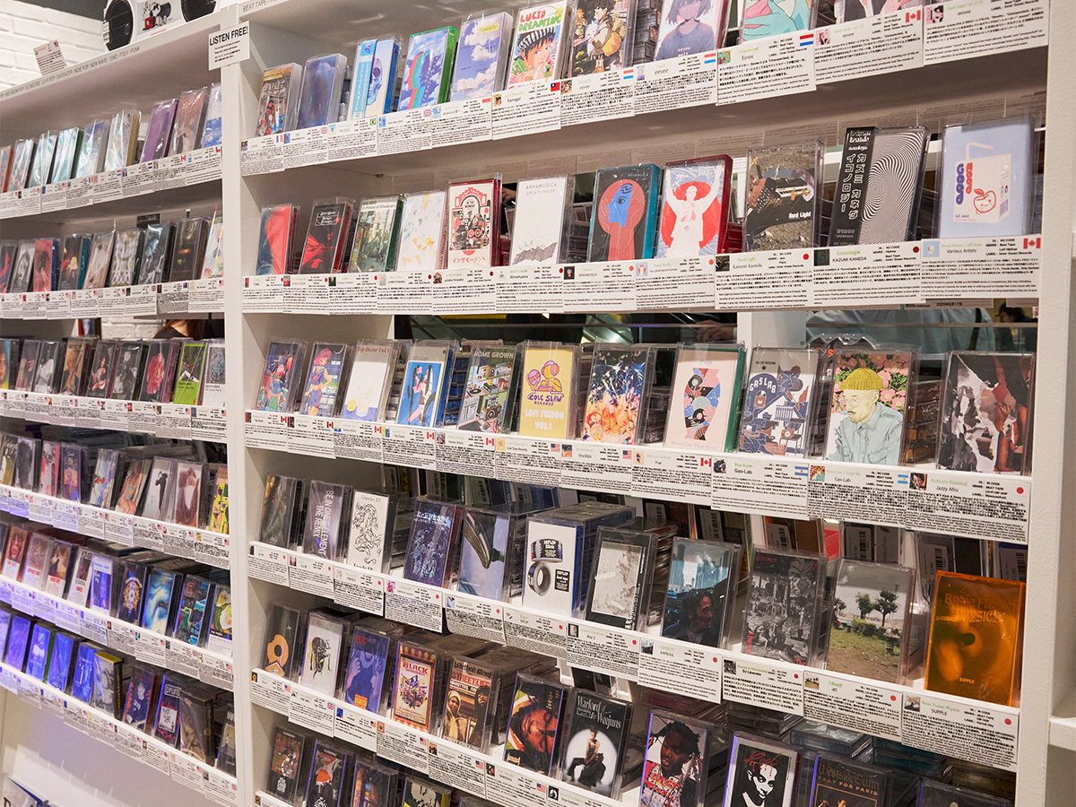 新旧入り混じるカセットの存在感とアイテムごとに異なる色のリズムが重なって、空間全体がひとつのコラージュのように見えます。