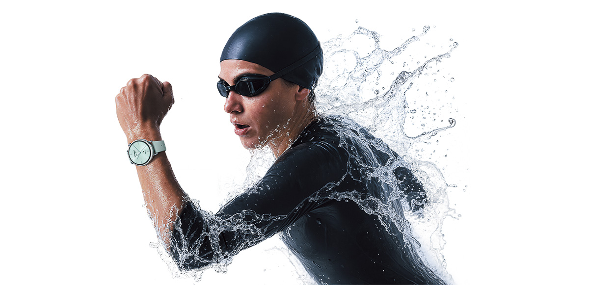 広範囲の表示領域と3000ニトの明るさを備えたドーム型ディスプレイが大きな特徴。41mmサイズ(31.0g)で最長30時間、45mmサイズ(36.7g)で最長40時間と、軽量ながらバッテリー駆動時間が長いのが魅力。