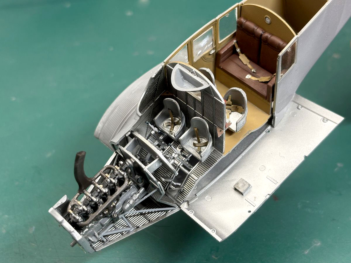 ▲胴体の外板を取り付けてしまうとキャビン内部はほとんど見えなくなってしまう。定員は4人で2人掛け革張りシートと1人掛けシートには当時珍しかったシートベルトが装備されていた。半解放型の操縦席は内装が塗装されておらず、ジュラルミンむき出しで質実剛健なイメージ