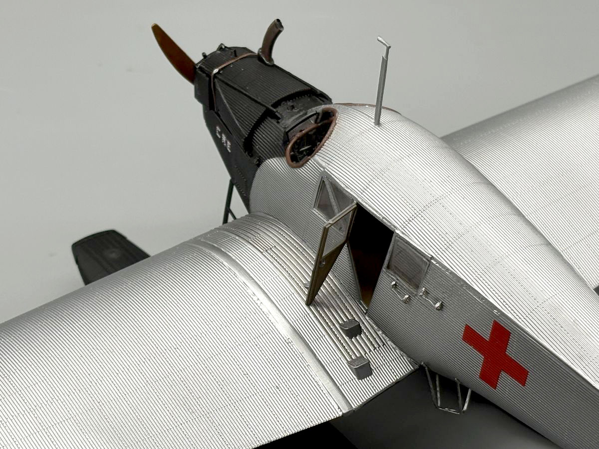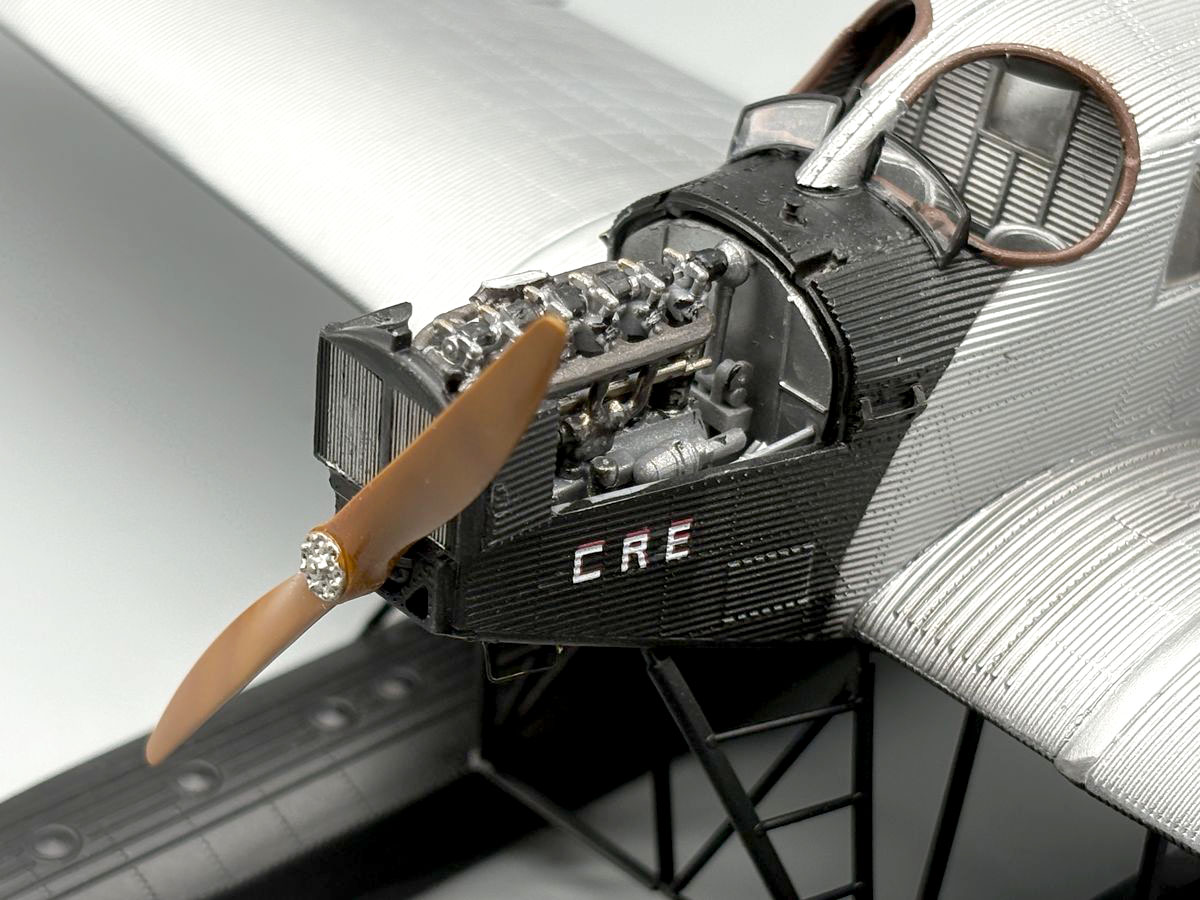 エンジンやキャビンは細部までディテールが再現されており、キャビン内部の照明やカーテンまで別バーツになっています。現代の旅客機と比べるべくもないのですが、飛行機が木製の機体に布張り翼の時代に暖房付きのキャビンを採用していた「F13」、乗り心地は最高だったんでしょう。