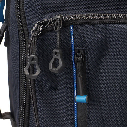 もちろん本体表面には撥水加工を施し、雨濡れの心配も無用。PCをはじめ水濡れ厳禁な機材もしっかり守ります。さらに前面のポケットに止水ファスナーを採用し、「中身は守られたけど、小物は濡れてしまった…」なんてこともありません。