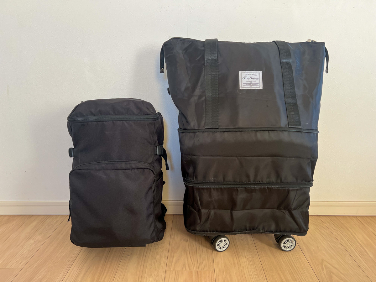 無印のリュックとコンパクトになるキャリーバッグを組み合わせて使っています。無印のリュックは大容量で収納が多く、出し入れがしやすいところが魅力。最も気に入っているのは、このキャリーバッグとの相性が抜群に良い点です。