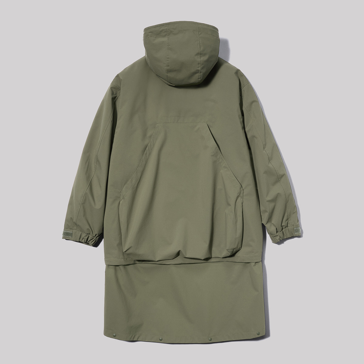 背面には大きなバッグを縫い付けています。ドットボタンで裾を折り上げられるのでシルエットを変えて着こなすことも。