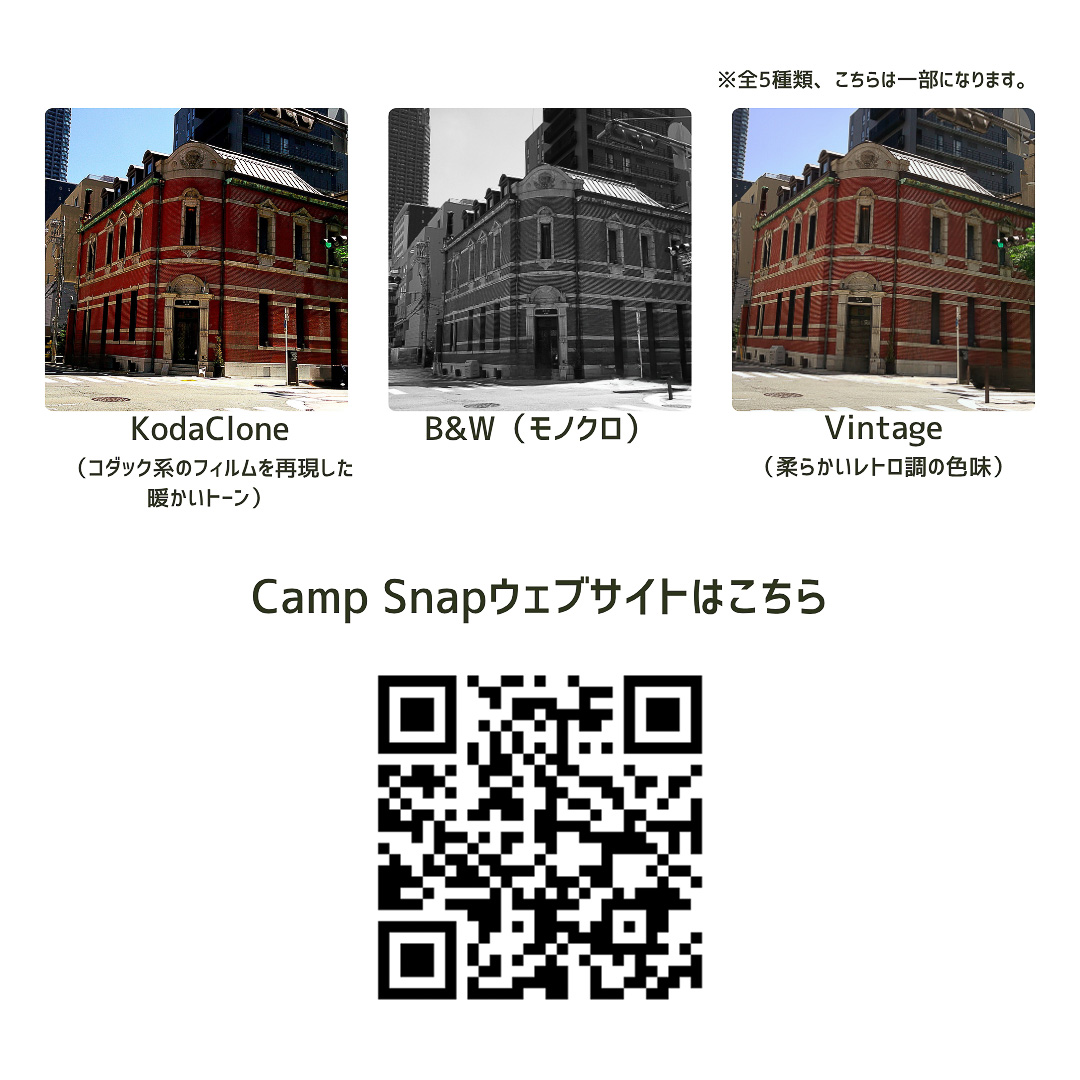 なお、デフォルトでスタンダード、モノクローム、ヴィンテージなどのフィルターも設定できますが、Camp Snapのウェブサイトでは自分好みのカスタムフィルターを作成することも可能です。同じ写真でもフィルターが変われば大きく印象が違ってくるはず。