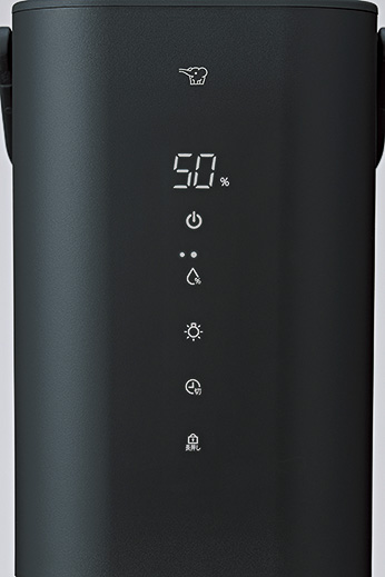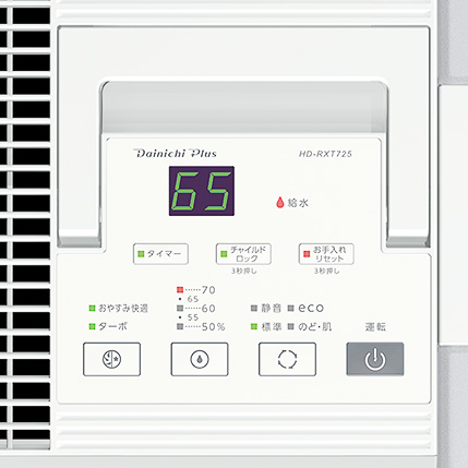 ▲見やすい操作パネル。湿度設定は50、55、60、65、70%。運転モードもシーンに合わせて、標準、静音、eco、のど・肌から選べる