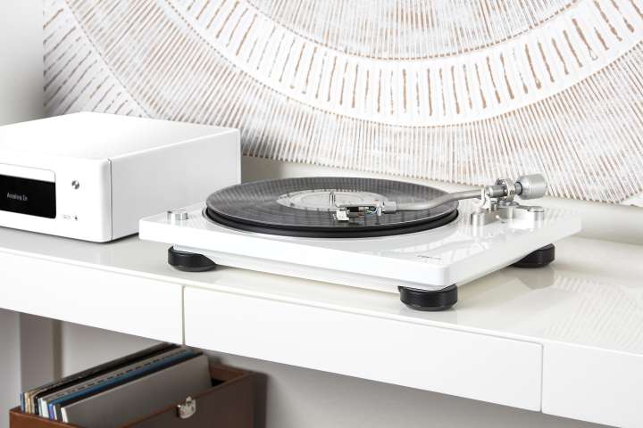 本体色はブラックのほかフレッシュなホワイトカラーを展開するが、独特な形状をしたダストカバーがそのままレコードジャケットを飾るスタンドとして使えるなど、レコード好きを楽しませる“隠し味”が多いのも特長だ。