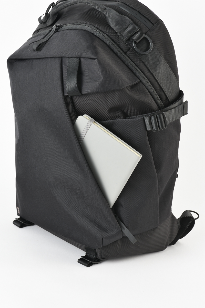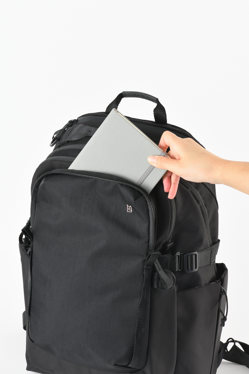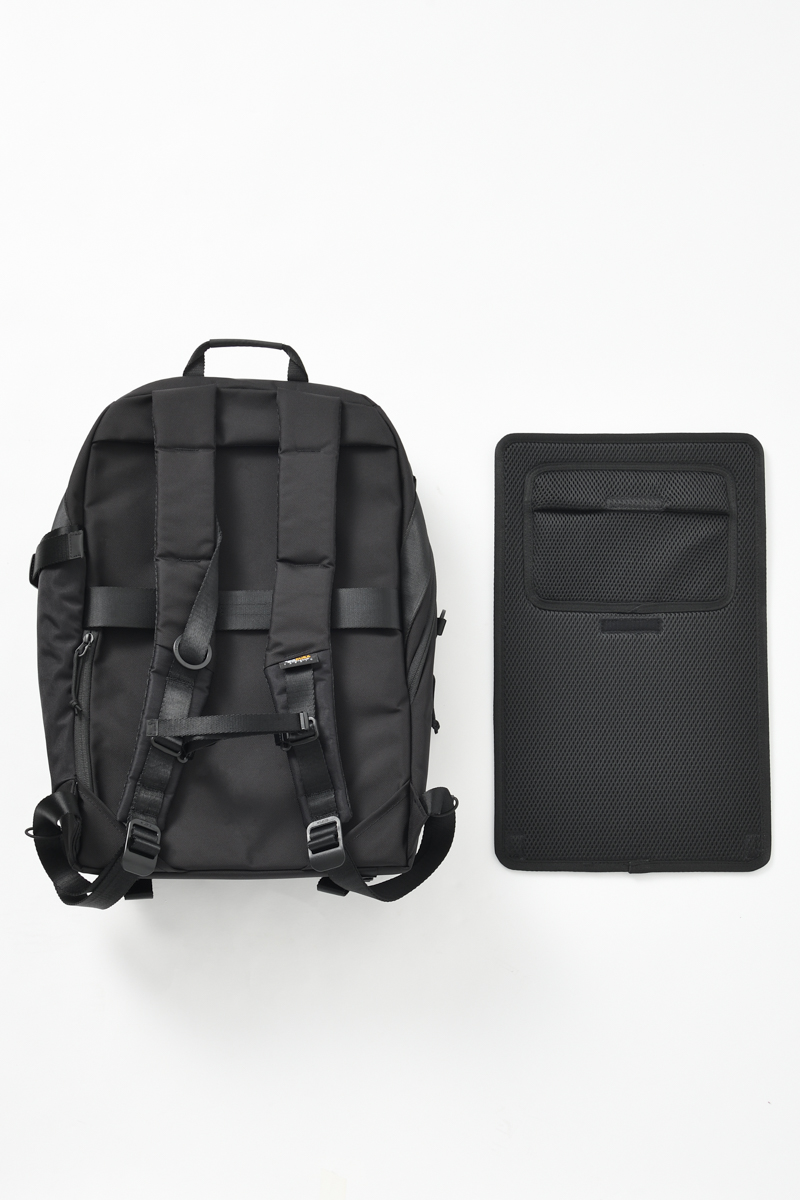 また、このシリーズで最も特徴的なのが背面まわりです。メッシュパッドは着脱式で、汚れが気になれば丸ごと洗えます。長時間背負うと、冬でも電車移動や屋内で背中が熱を持ちやすい場面がありますが、パッドを洗ってリセットできると気持ちよく使い続けられます。上部には薄いポケットもあり、保冷剤を入れることも可能。背面パッドを洗えるというのも相まって真夏にも嬉しい仕様です。