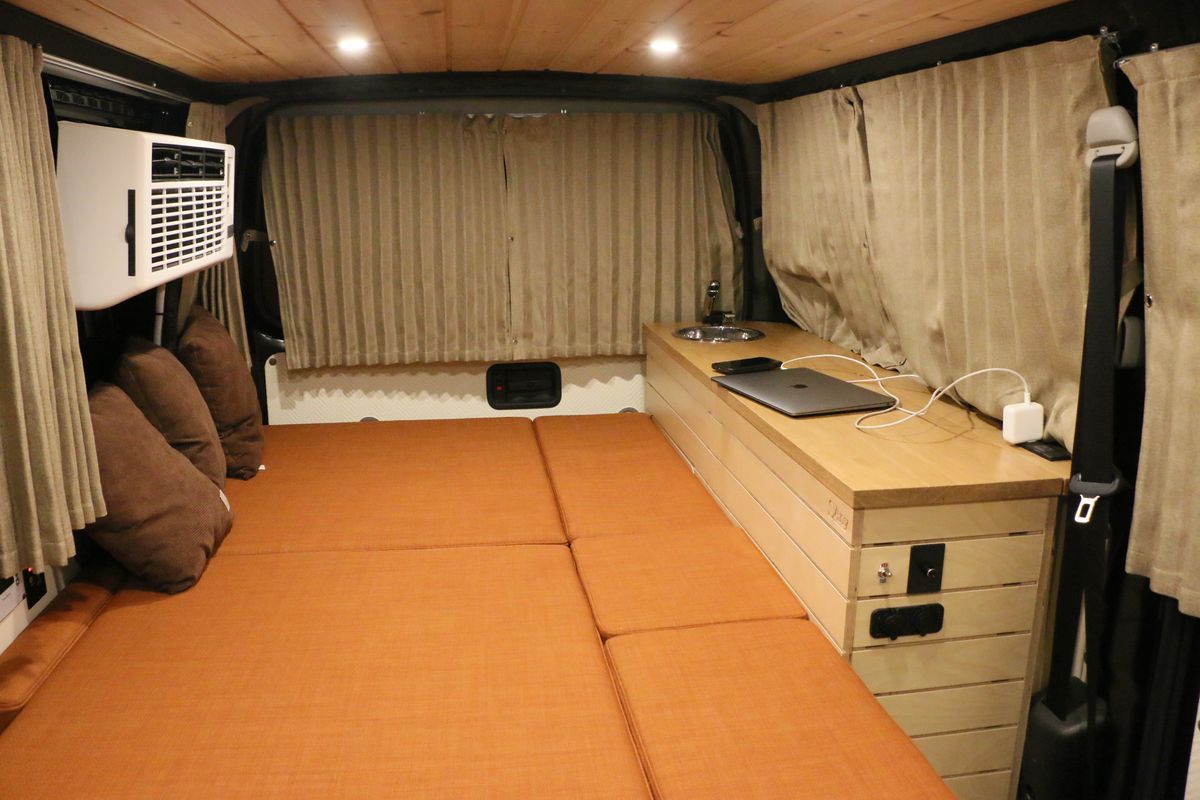 キットの主な内容は、大人ふたりが寝られるベッドに展開可能なソファ、ガスコンロを置けてシンクを備えたキャビネット、そして天井と床にはウッド素材が貼られています。天井にはLEDのダウンライトも備えられ、電源としてEcoFlow製のポータブル電源(容量512Wh)も付属。天井まで木目調の内装で、暖かみのある落ち着ける空間に仕上がっています。