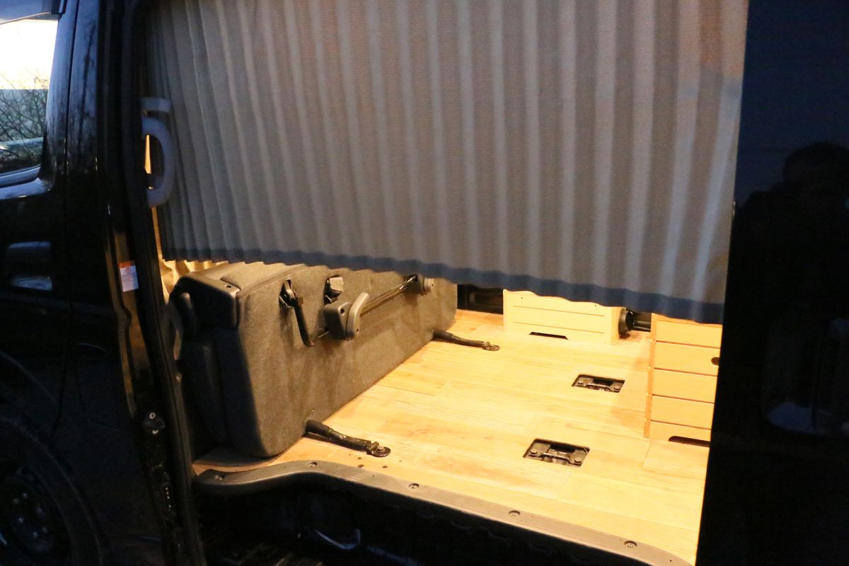 キットはセカンドシートを活かしたまま装着できるので、2列シート車なら乗車定員などを変更しなくて済むのもメリット。セカンドシートを畳めば結構広い空間が出現するので(この部分にもウッド素材の床が貼られています)、キャンプで使用した道具などを入れておくこともできます。そのスペースで靴を履いて、サイドのスライドドアから出入りできるので、夜中にトイレに行くときも出入りしやすかったのが印象に残っています。