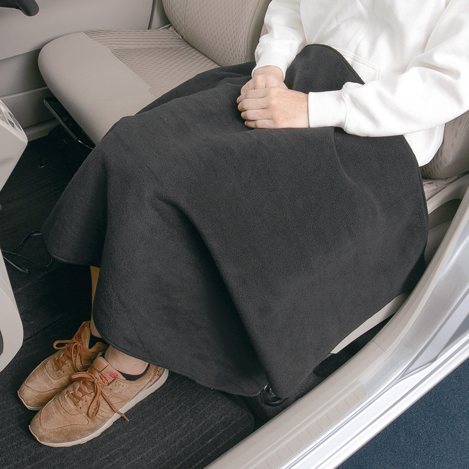 車内が寒いときに下半身を温めてくれる、電熱ヒーター付きのひざ掛け。ヒーターが高温になったときは一旦加熱がストップ。低温になったら再加熱してくれるのが便利。USB電源なので、車中泊やデスクワークなどでも活躍する。
