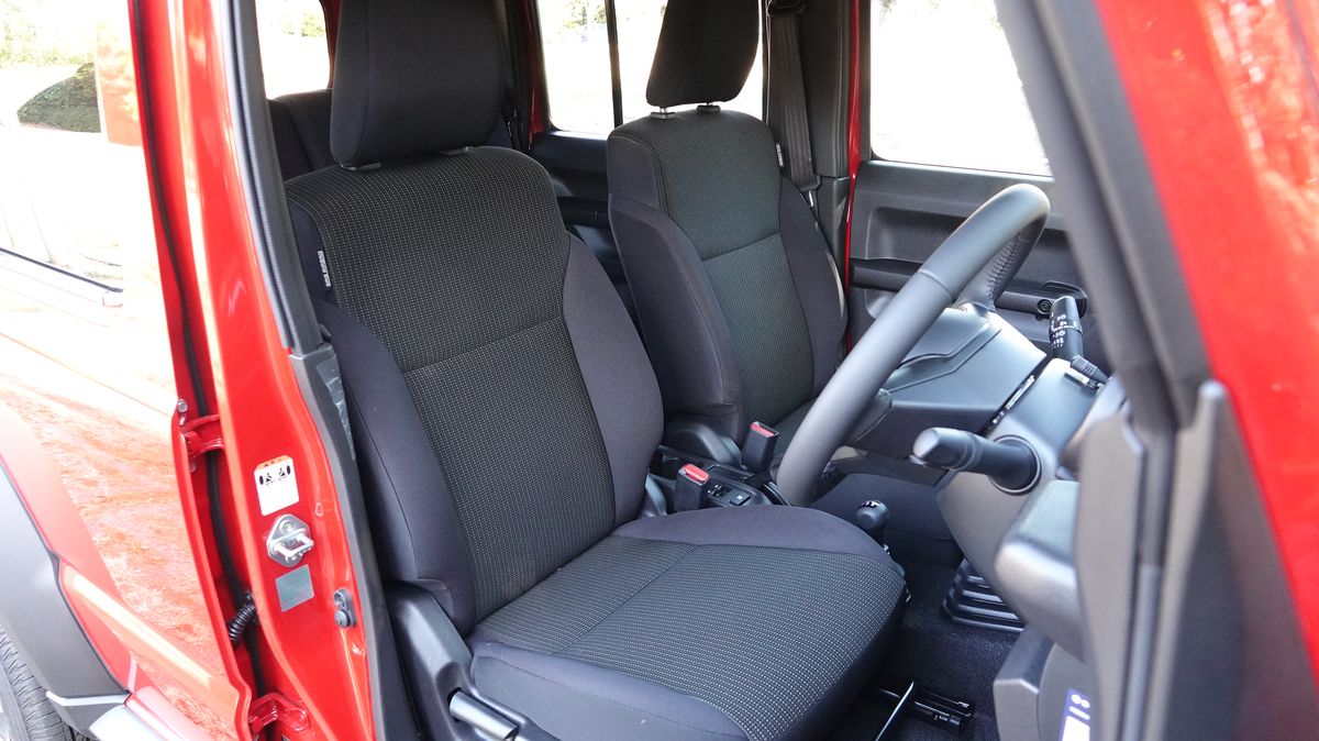 ▲ジムニーに比べてフロントドアが短くなり使い勝手が向上。後席のヒップポイントはジムニーよりも50mm後方にずらされ後席空間が拡大された
