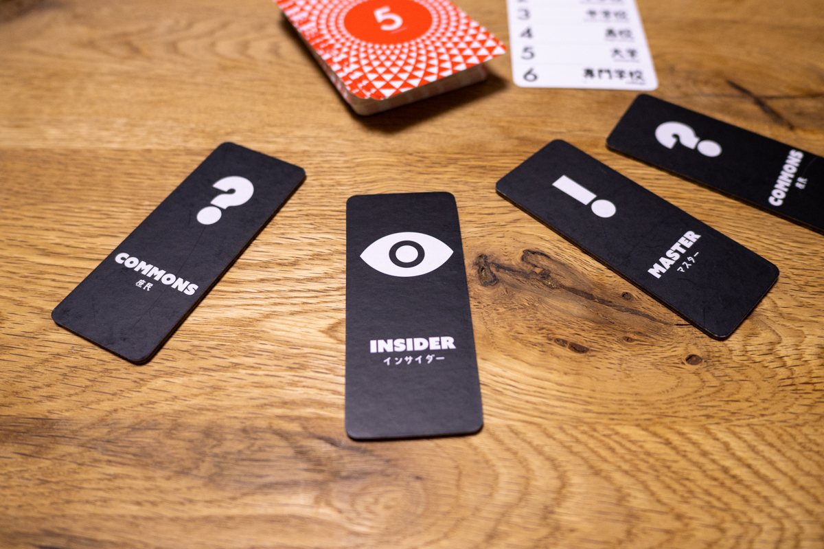 役割は3つ。“マスター”、“インサイダー”、“庶民”に分かれます。マスターはプレイヤー兼進行役で、最初からお題(正解の言葉)を知っています。そして、インサイダーも正解を知っていますが、そのことを隠したままプレイ。一方、庶民は何も知りません。