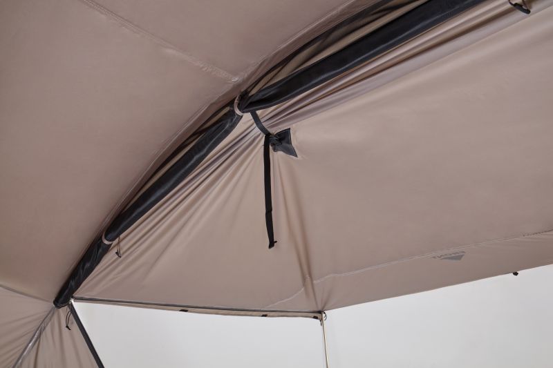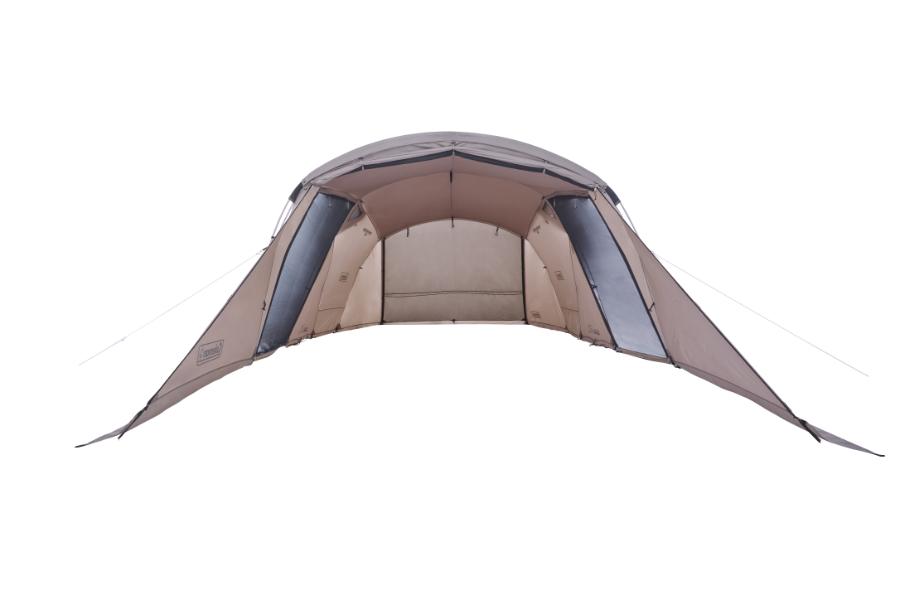 居住空間は2ルームらしく広く、圧迫感を抑える工夫も盛り込まれています。巻き上げたキャノピーをバックルで固定し、視界を広く取れる「ハイビューシステム」によって、天井の抜けが良くなり、室内の開放感が増します。テント内で大人が立てる高さを確保しているのも、コールマンのこだわりポイント。