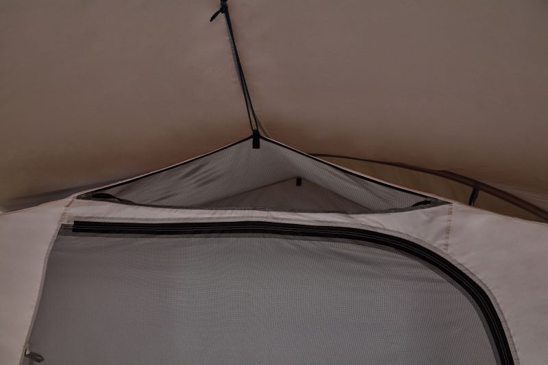 快適性面では、換気まわりの作り込みも丁寧。フロントキャノピー下のアンダーベンチレーション、インナーテント前方のアンダーベンチレーション、そして上部のベンチレーションが連携し、空気が抜ける道筋が確保されています。