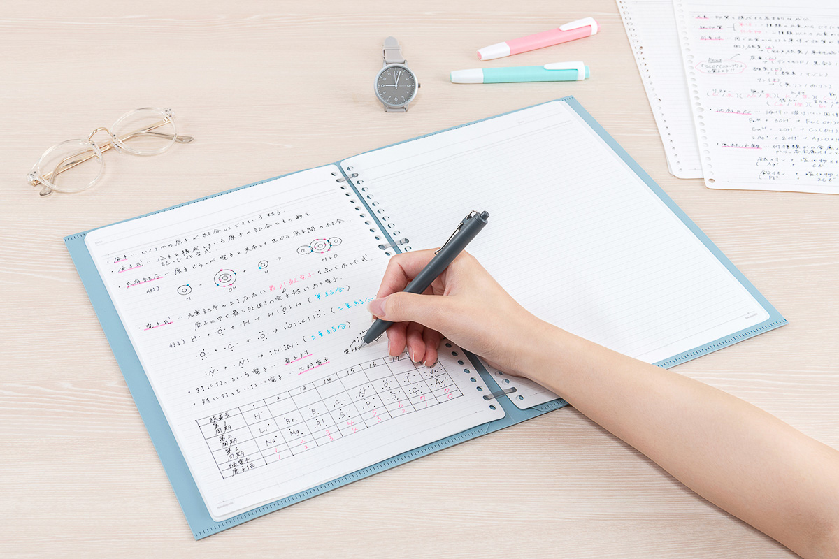 もちろん“フラットバー”の採用により、文字もルーズリーフの端までしっかりと書き込むことが可能となり、ノートの左右端まできっちりと有効活用ができます。その気持ちよさは想像以上! 美しく、そして無駄なく書き込めると勉強や作業も捗るというものですよね。
