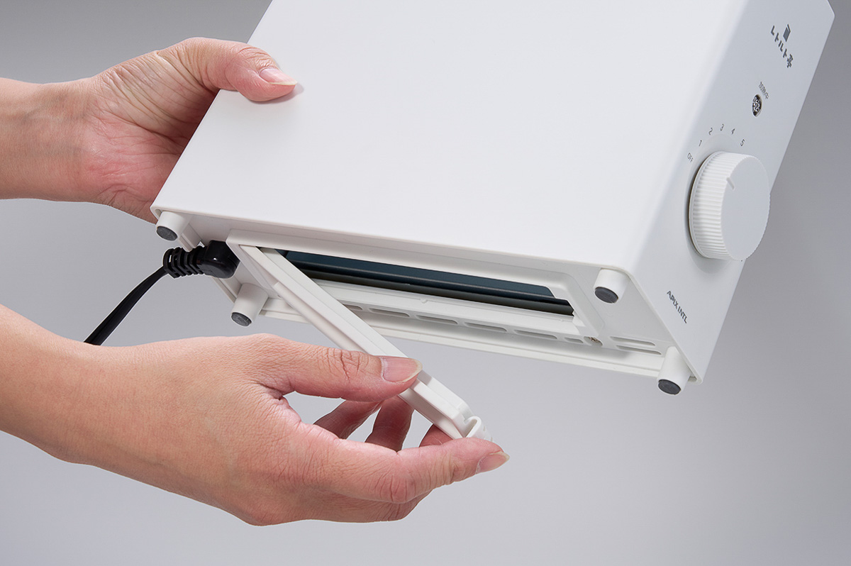 本体は前機種と比較して約20%小型化(W230×D80×H175mm)。そして約50%も軽量化し約0.8kgとなり、設置場所を選ばず、より取り回ししやすくなりました。狭めのキッチン周りやオフィス、さらに車中泊にアウトドアと、どこでもあたたかな食事が取れますね。