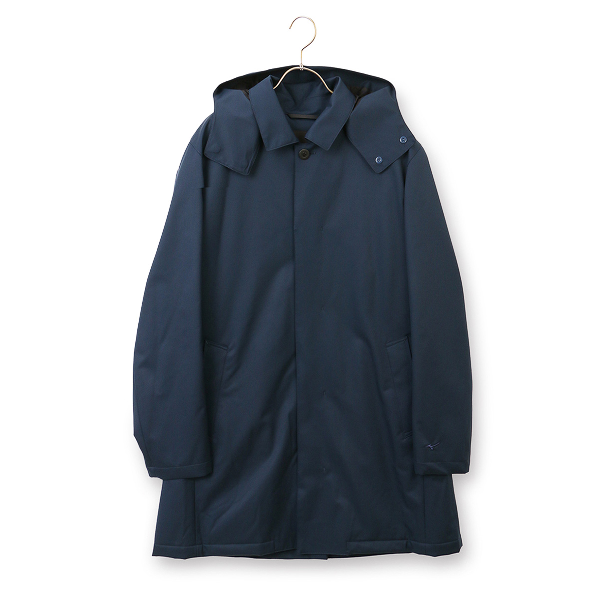 ミズノ独自の吸湿発熱素材「ブレスサーモ」を使用し、着用シーンを拡大させたフード付きステンカラーコート。袖は動きやすさと軽量化を狙い中綿をあえて入れず、防風性能に優れた表生地により温かさを保つ仕掛けが光る。