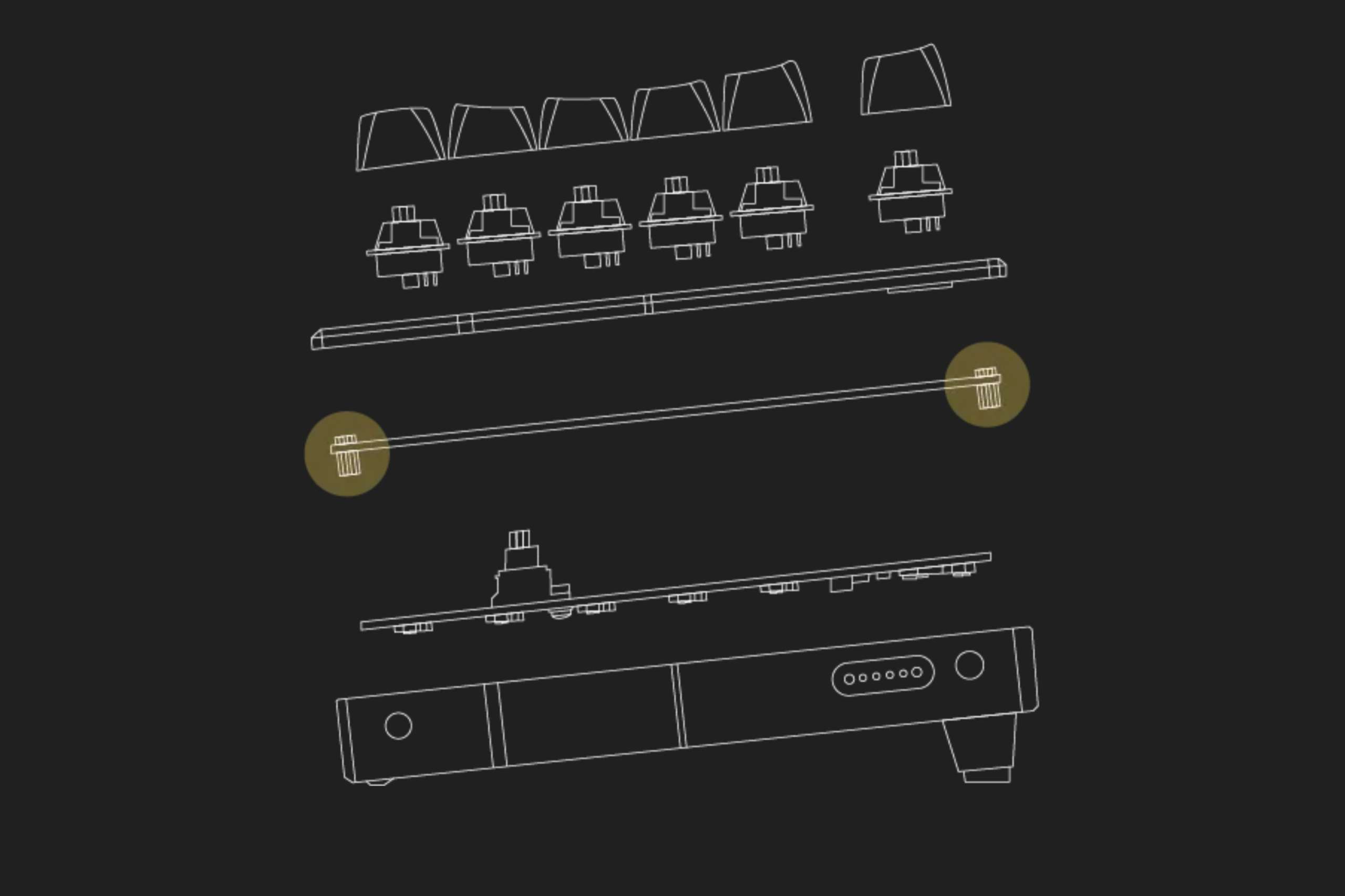 打鍵感も、長時間使用を想定した構成です。内部にはガスケットマウント構造を採用し、キーを押し切った際の衝撃をやわらかく受け止める設計。硬さを前に出すタイプではなく、底に当たる感触が比較的穏やかです。スイッチプレートは真鍮製とFR4製の2種類から選択でき、重さを取るか、軽めの打ち心地を取るかで方向性を選べます。