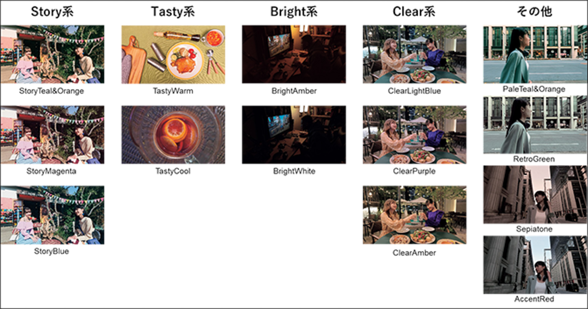 ▲天気の良い屋外、暗めのカフェ、温かい食べ物など、14種類のカラーフィルターをシーンや好みで選べる
