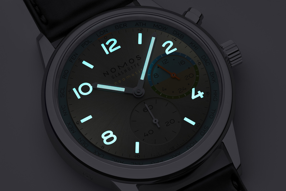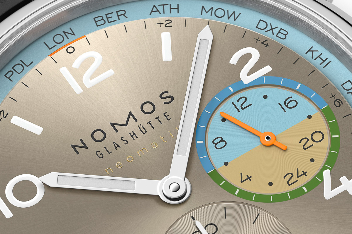 ケース径は40mm。2時位置のボタンをノックするとダイヤル外周の都市リングが回転するのと共に時針が1時間進み、カチっと旅先のローカルタイムを表示するワールドタイム機能が特徴。ワールドタイム時計でありがちな複雑な表示とはかけ離れたノモスらしいシンプルなデザインが魅力です。