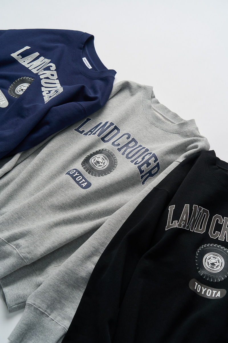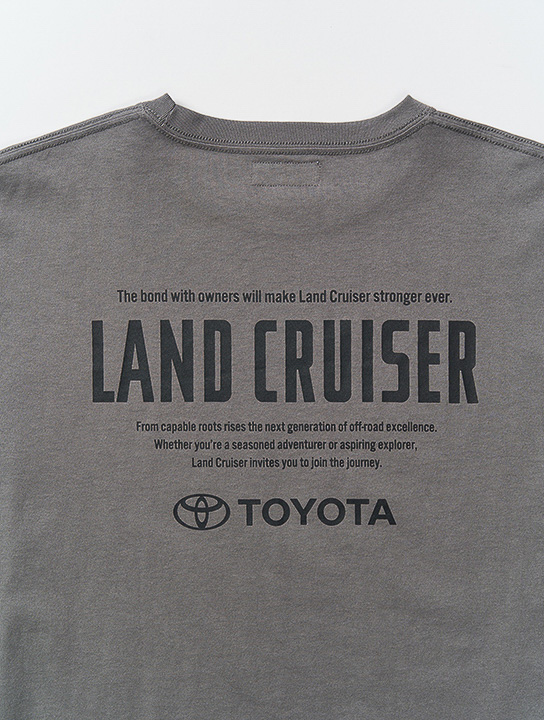 胸元には「LAND CRUISER」のクラシックなロゴ、背面にはタイポグラフィックなテキストを大胆にプリントしています。カラーはブラックとカーキの2色でM、L、XLの3サイズを展開。