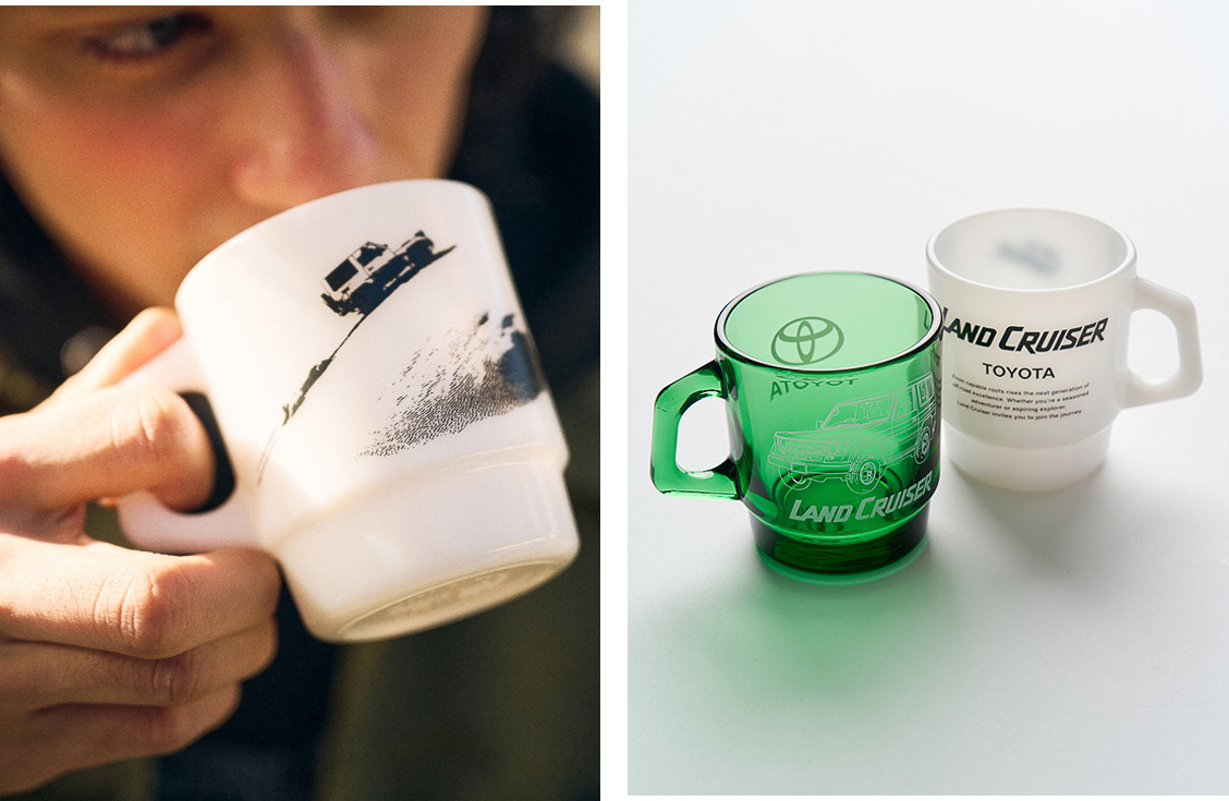 また、アパレル以外にトランクカーゴとコラボしたローサイズのコンテナボックス「ランドクルーザー×トランクカーゴ 50S LOW」(4980円)やFire-Kingの名作マグカップとコラボした「ランドクルーザー×Fire-King スタッキングマグ “デューン”」(4950円)もラインナップしています(マグカップは1月16日に発売予定)。