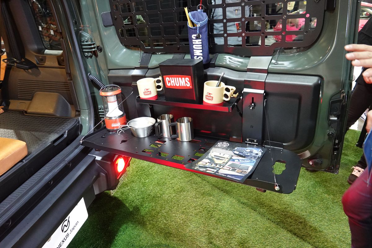 室内が広くなったノマドは車中泊を楽しむことを考えている人も多いはず。助手席側にコーデュロイ×レザーのマットを装備し、リアゲートには折りたたみ式のテーブルが装着されています。