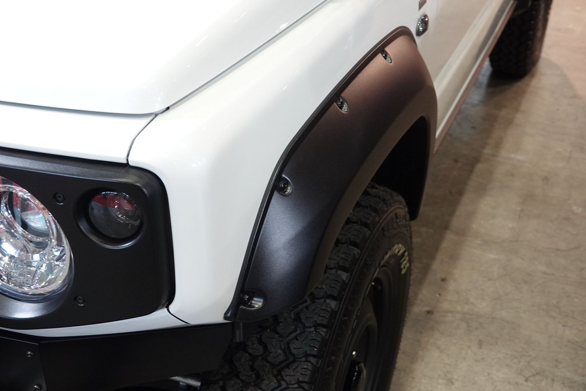 ジムニーカスタムパーツメーカーの老舗であるAPIOではそんな声を受けてシエラの全幅を片側約30mm短くして林道での走破性を高めたナロースタイルを展開。そして今回のオートサロンで、新たに開発したノマド用のナローフェンダーとサイドシルガードを装着したモデルを展示しました。