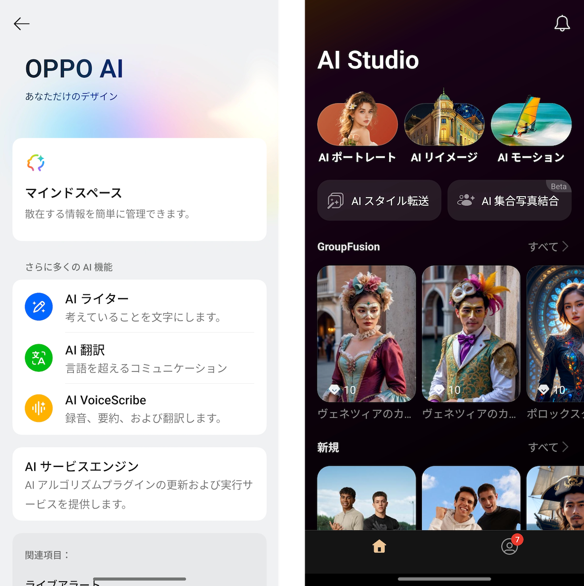 OPPOは昨年来、独自のAI機能「OPPO AI」にも注力しています。文章の作成・校正、録音した音声の文字起こし・要約、翻訳などを行え、「AI Studio」というアプリで、写真を絵画風に変えたり、ユニークなプロフィール画像を作ったりもできます。