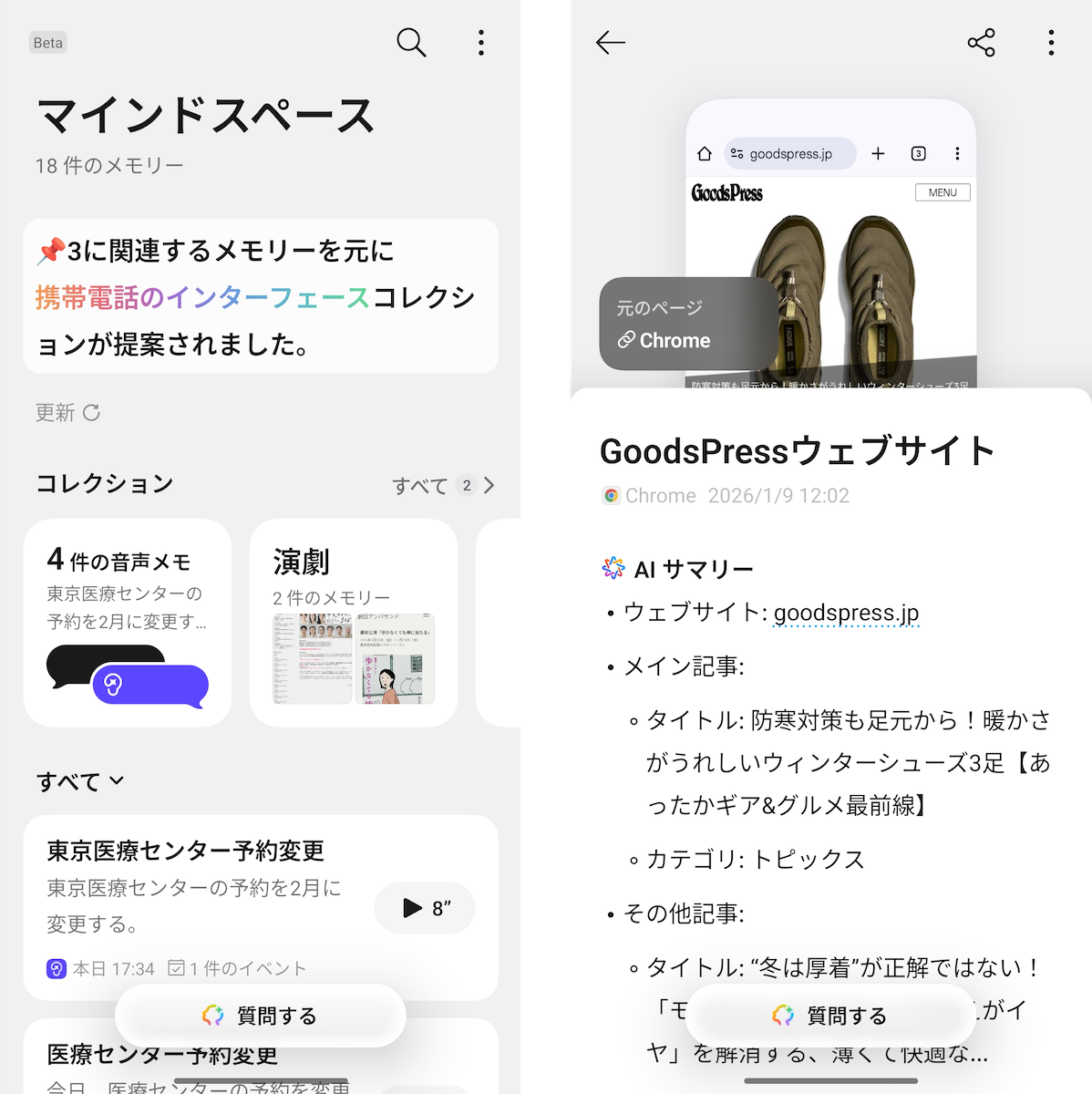 ▲マインドスペースを開くと、自動で整理されたスクショや文字起こしされた音声メモを確認できる。スクショは要約も表示される