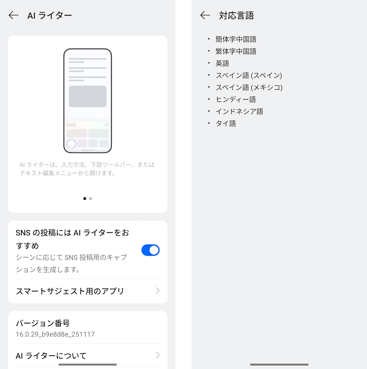 ▲この機種から、ColorOS 16(ベースはAndroid 16)になったためか、AIライターは日本語未対応だった。「レコーダー」の文字起こしや「翻訳」は日本語に対応しているので、AI ライターも早い対応を期待したい