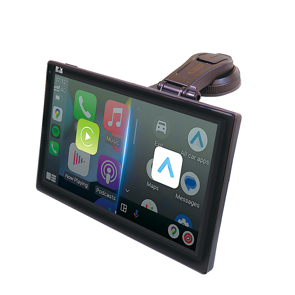 ▲高さが抑えられたボディはオンダッシュ装着でも前方視界を妨げにくい。Airplay、Androidによるミラーリング動画視聴にも対応