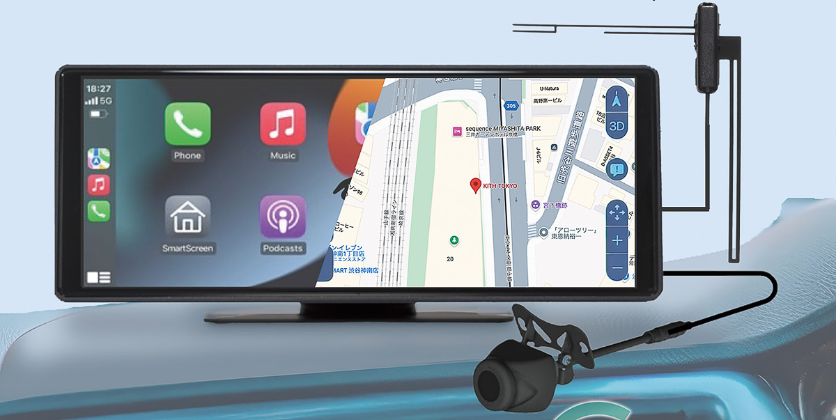 クルマを選ばず手軽に取り付けられるポータブル型のディスプレイオーディオ。10.1インチの大画面は優れた視認性、タッチパネル操作性を発揮する。Apple CarPlay/Android Autoの無線接続やフルセグテレビチューナー内蔵も魅力だ。