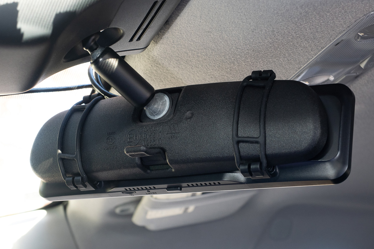 ▲本体は純正ルームミラーに重ねて付属ゴムバンドで固定。前後カメラはガラスに両面テープで貼付