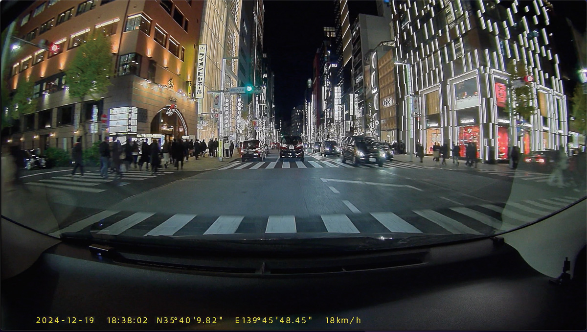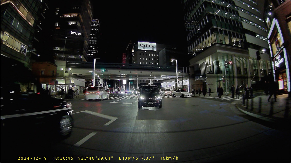 ▲夜間(後方)。カロッツェリア独自の「ナイトサイト」により、夜間でも明るくクッキリとした映像記録が可能だ。HDR機能により白飛びや黒つぶれも抑えられている