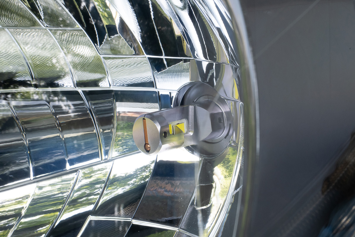 ハロゲンバルブと入れ替え装着ができるLEDバルブ。路肩まで明るいワイドな配光で、点灯直後の明るさを長時間キープ(光束維持率98.5%)できるなど優れた信頼性を持つ。車検に対応し2年間の長期保証も付帯している。