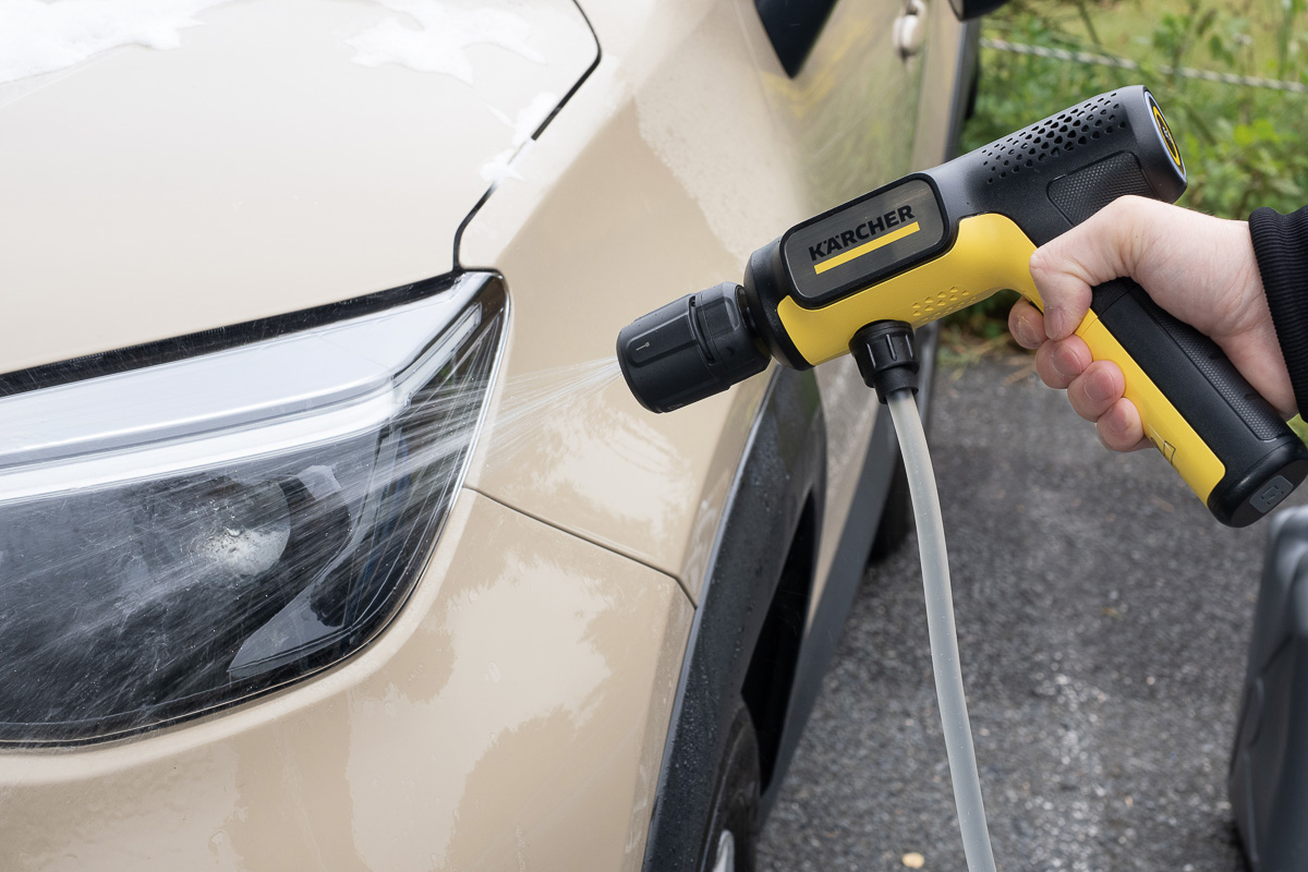 ▲お出かけ前に汚れが気になったらサッと取り出して洗車。小さくても強力な高圧洗浄だ