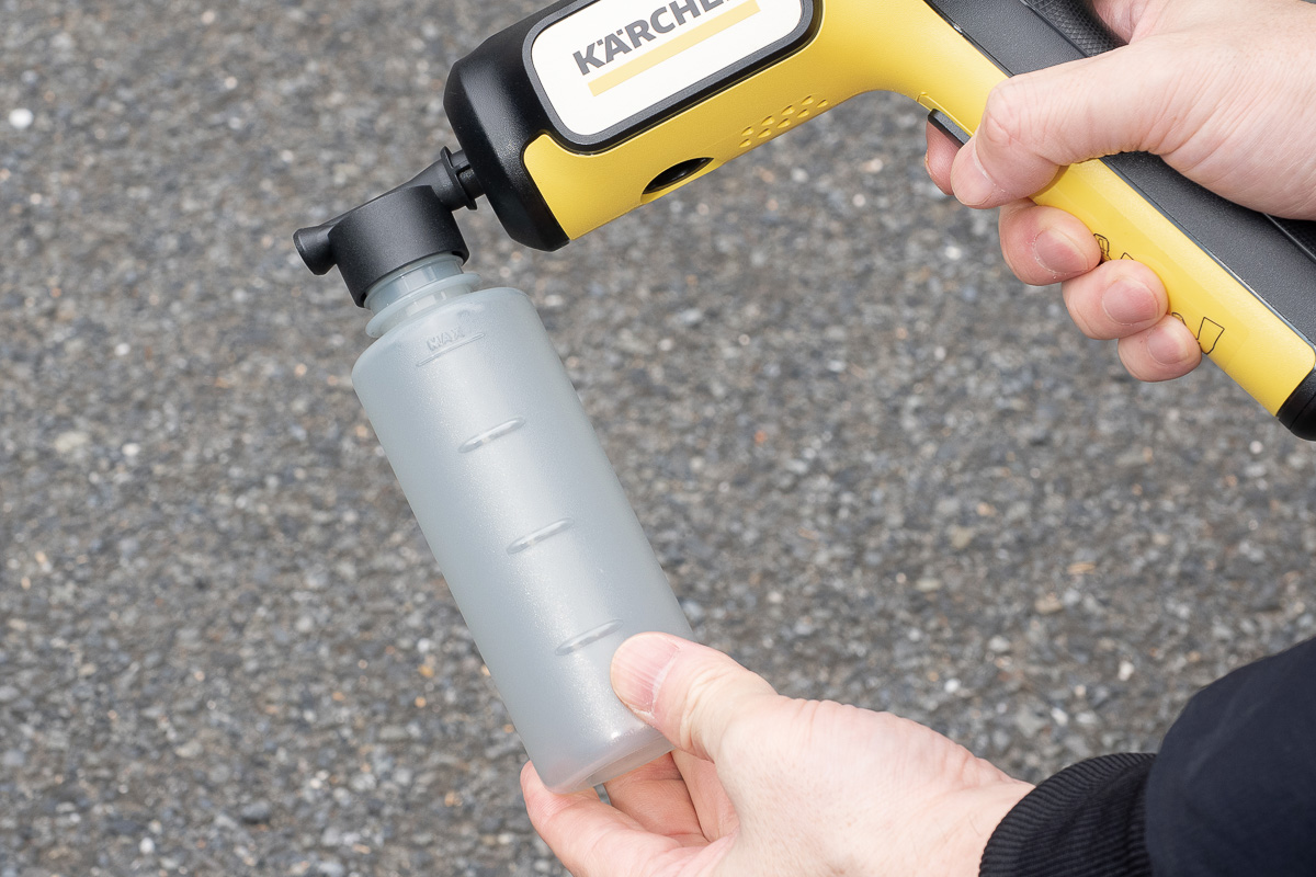 ▲洗浄剤ノズルにカーシャンプーを入れればシャンプー洗車もできる。頑固な汚れのときに活躍
