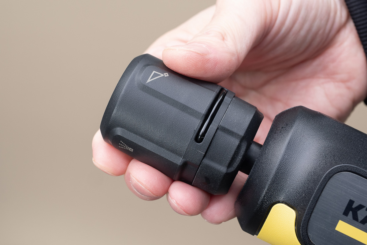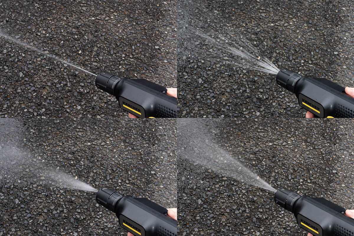 ▲ノズルはケルヒャー独自の4in1マルチジェット。上の写真のように異なる4つの噴射パターンで効率的な汚れ落としができる。左上からポイントジェット、シャワー、傾斜、標準幅広となる