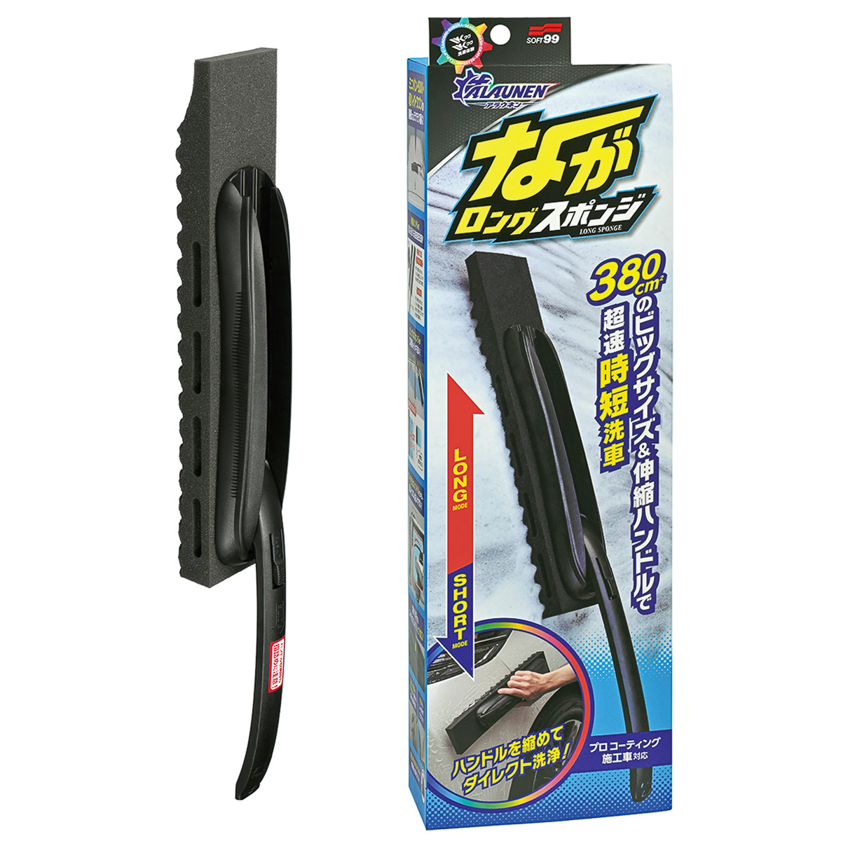 洗車面積が約380㎠というビッグサイズで薄型のスポンジに45←→67cmに伸縮するアーチ形状のハンドルを組み合わせ、作業性抜群。ミニバンやSUVなどボディの大きなクルマでも手早く効率の良い洗車作業が行える。