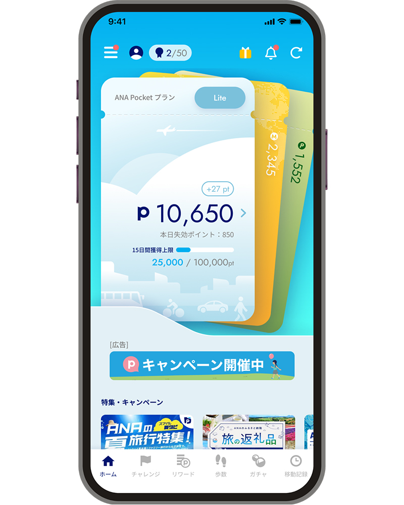 一定距離を歩く、移動量を重ねるといった条件をクリアすることでポイントが貯まり、貯めたポイントはガチャ形式でANAのマイルなどへと変換されます。
