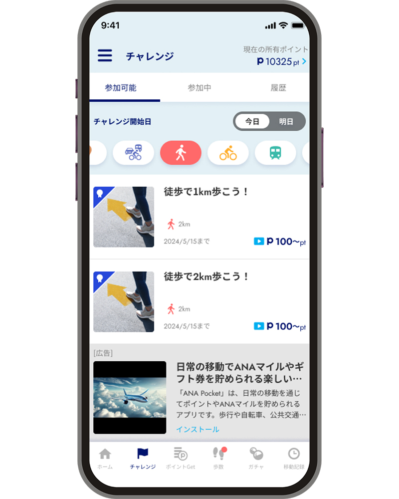 ポイントの獲得は、移動による自動加算に加えて、移動手段や距離でのミッションチャレンジ形式が用意されているのも特徴。